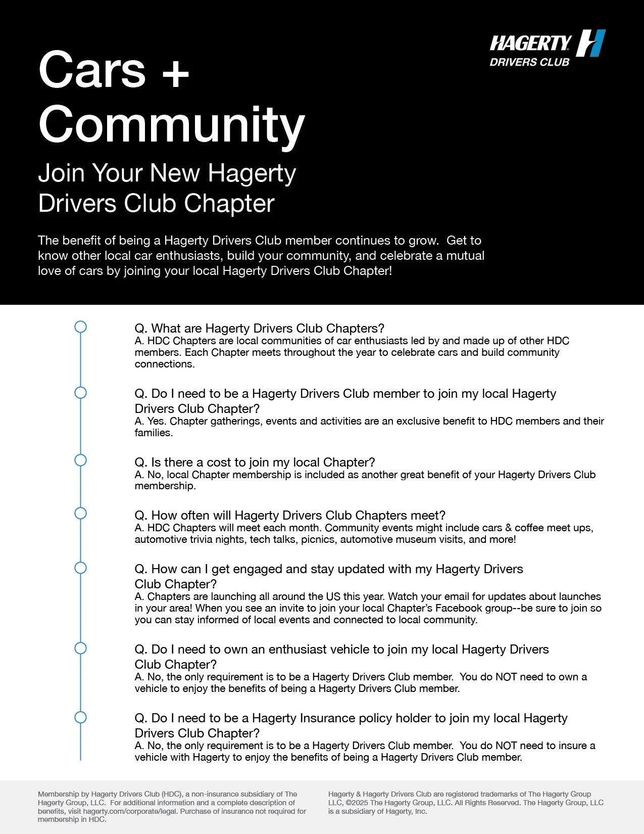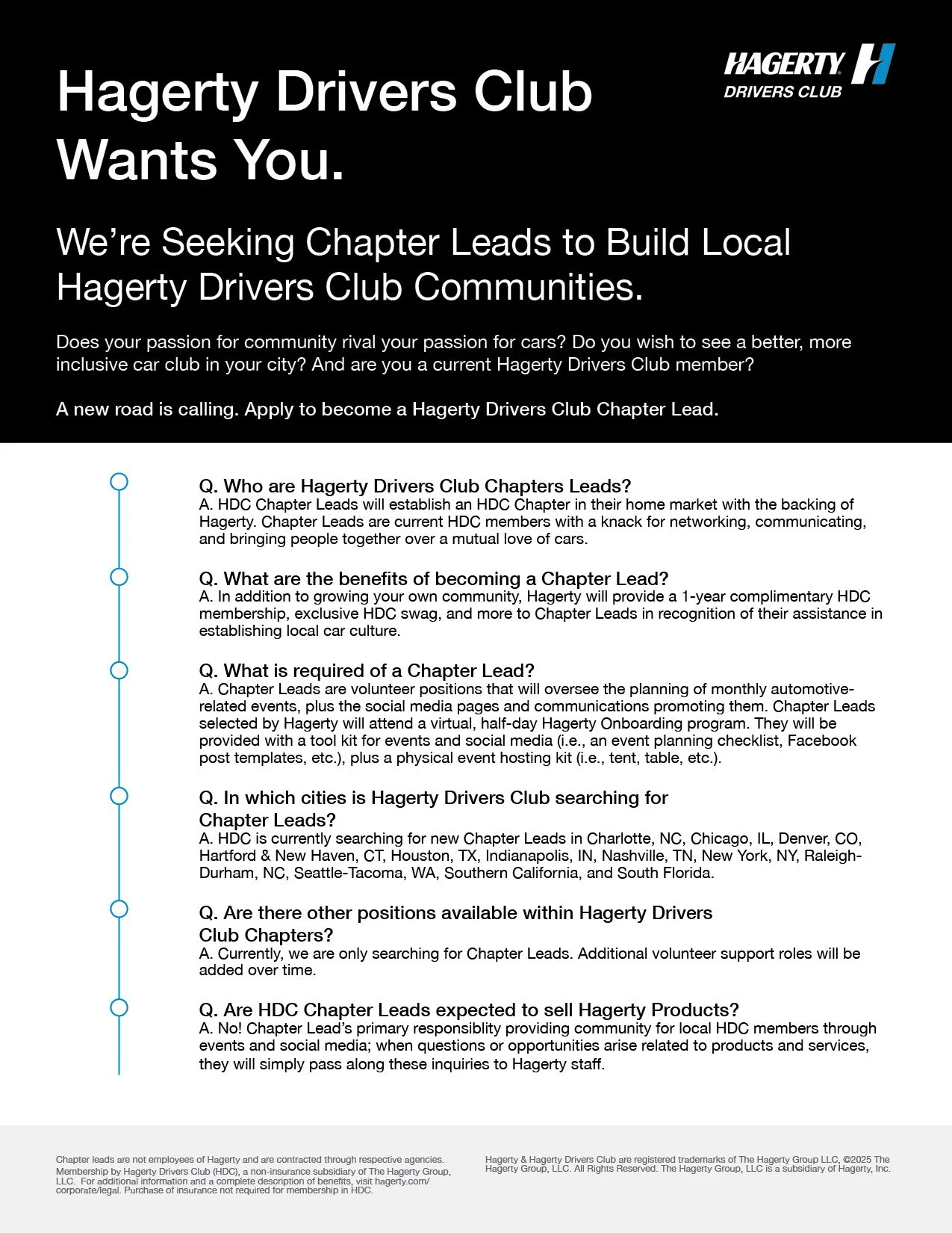 Hagerty Drivers Club is seeking good car people to care for our local chapters. As a Chapter Lead, you’ll organize exciting events and create camaraderie online. In return, you’ll receive special benefits like a 1-year complimentary membership, exclusive swag, and more. Apply now to take the wheel!